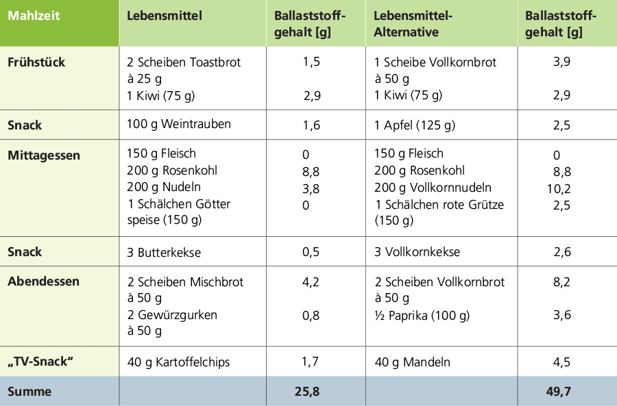 Durch das Austauschen ballaststoffarmer Lebensmittel durch ballaststoffreiche Alternativen funktioniert die Umsetzung der Empfehlungen leichter als man denkt. Hier einige weitere Beispiele: